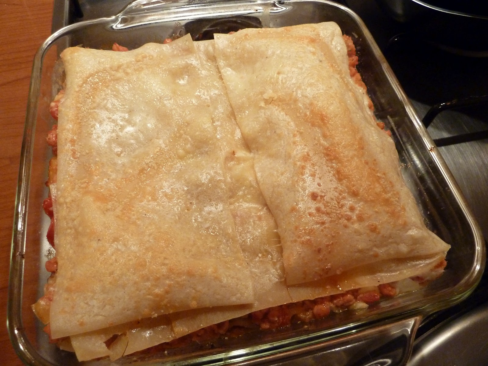Pas 14: Se aşează foile de lasagna(nefierte) pe fundul vaselor. Eu am avut foi care nu necesită fierberea în prealabil. |