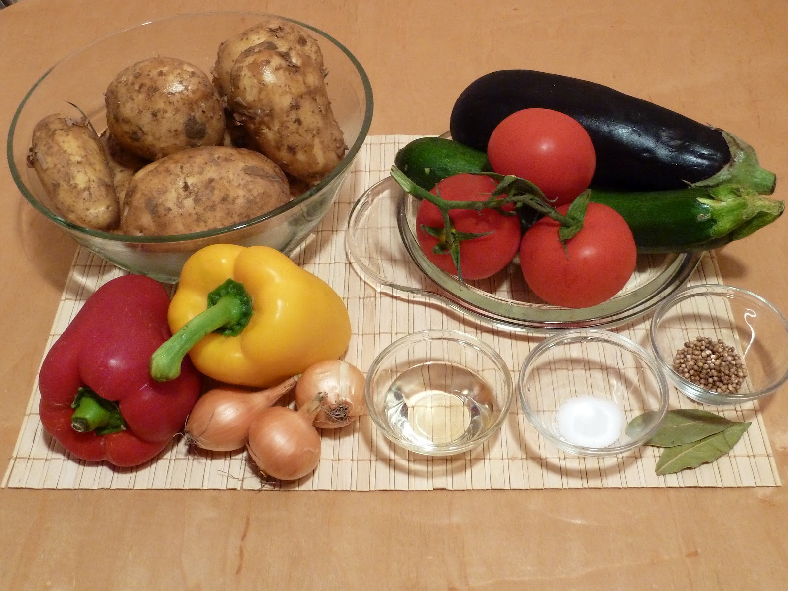 - 4-5 cartofi noi - 1 vânătă - 1 zucchini - 3 roşii - 1/2 ardei roşu - 1/2 ardei galben - 3 cepe - 5 linguriţe ulei - 2 linguri sos de tomate - 1 linguriţă coriandru - 2 frunze de dafin - sare - piper alb |